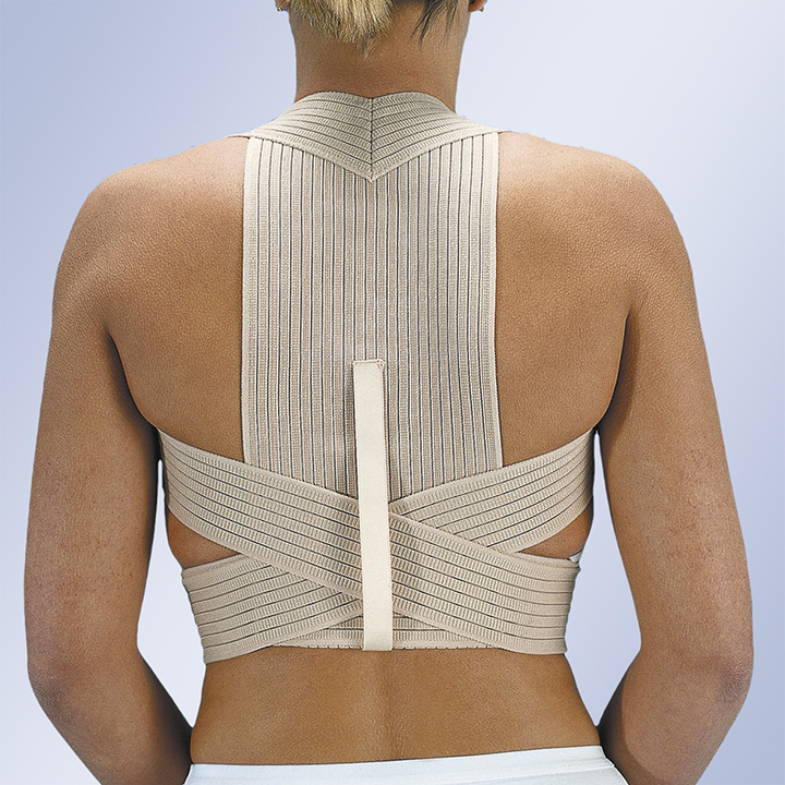 Banda ancha dorsal de tejido elástico multibanda transpirable. Dos bandas superiores que se prolongan sobre los hombros pasan por debajo de axilas, cruzan por la espalda y cierran en el abdomen permitiendo ejercer una tracción gradual de la espalda mediante la retropulsión de los hombros hasta suprimir la mala postura cifótica.