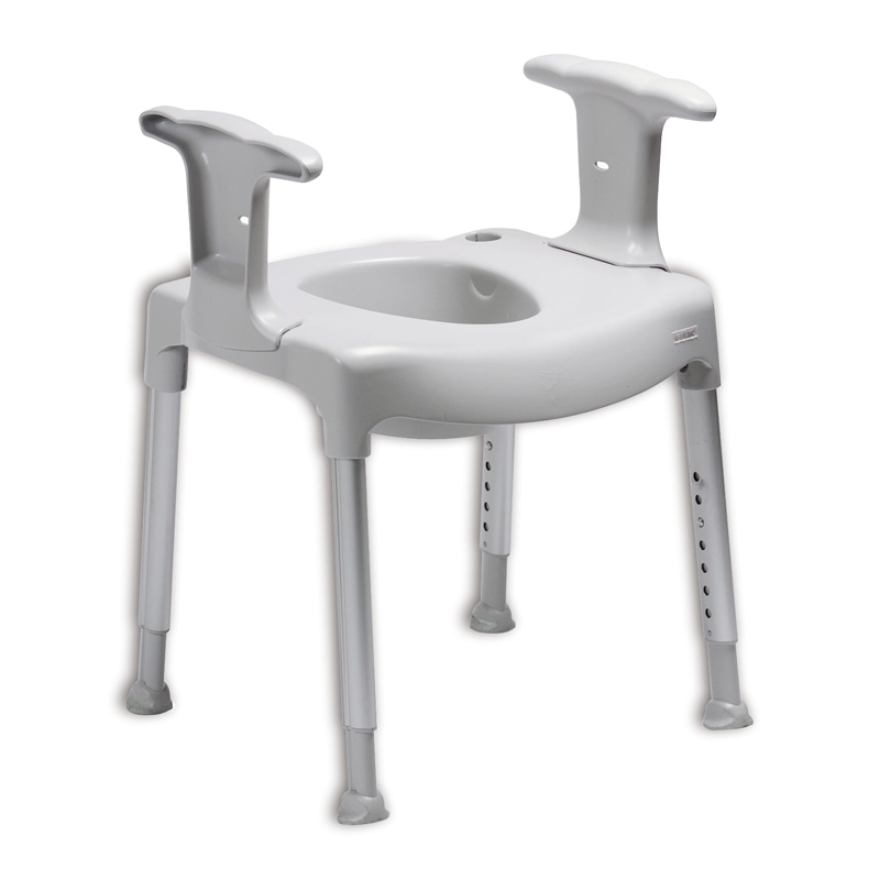 Elevador de asiento inodoro con reposabrazos. Este asiento es muy funcional y estable. El asiento puede ajustarse en altura y ligeramente en ángulo de inclinación para que sea más fácil levantarse.